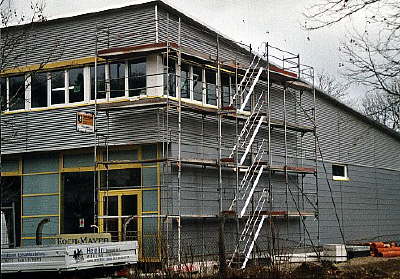 Fassadengerüst mit Komfort -Layher-Blitzgerüst mit vorgebautem Treppenaufstieg- leicht begehbar- sicherer und- schneller Aufstieg
